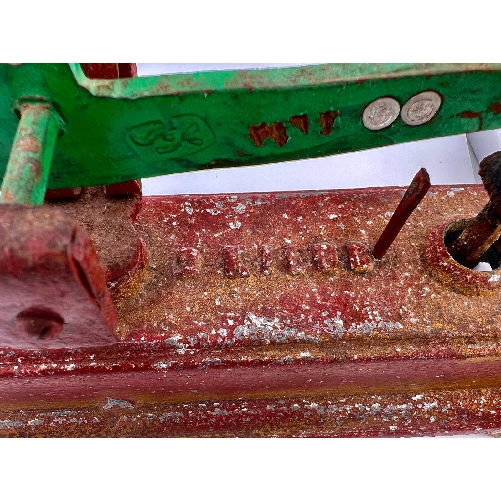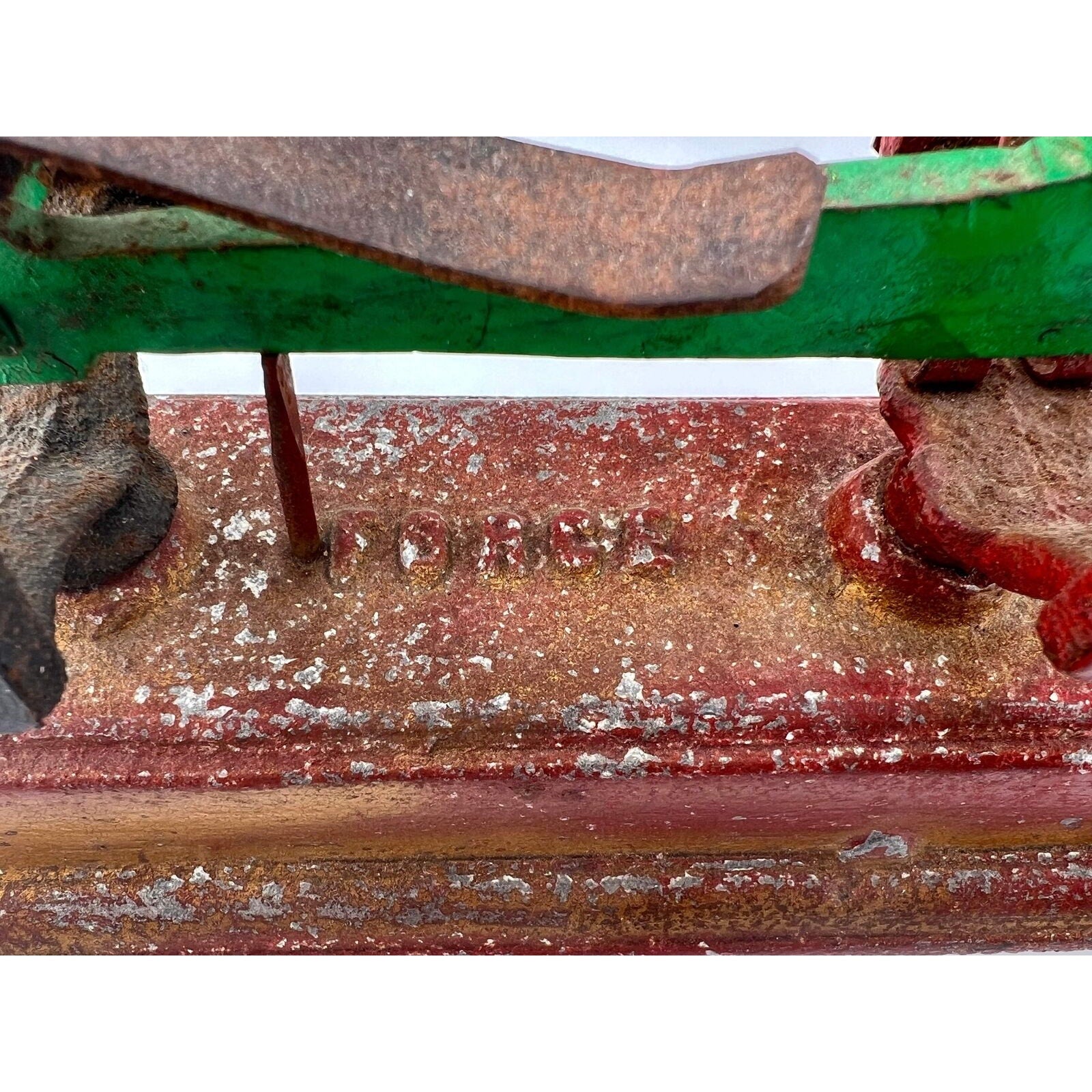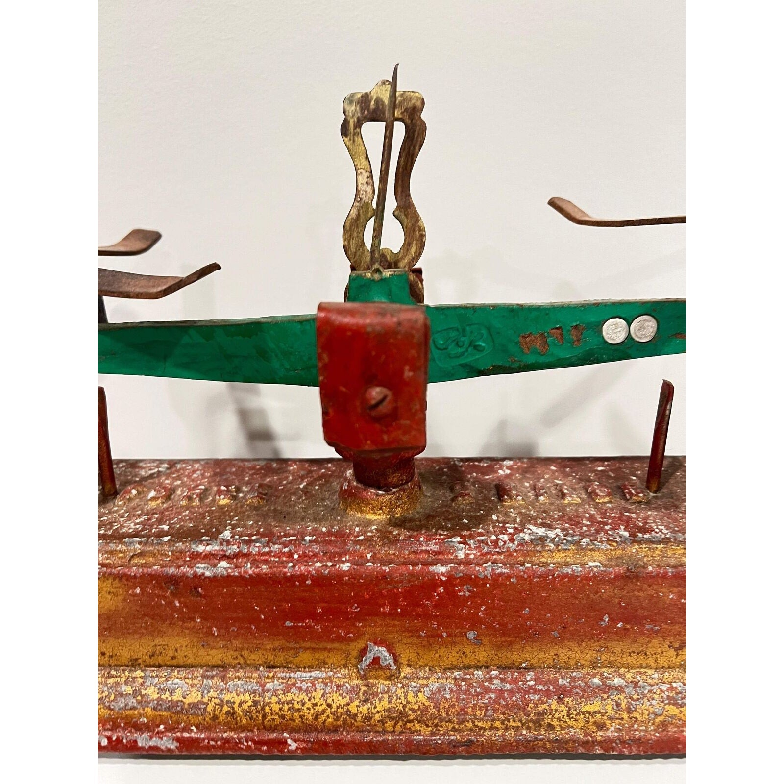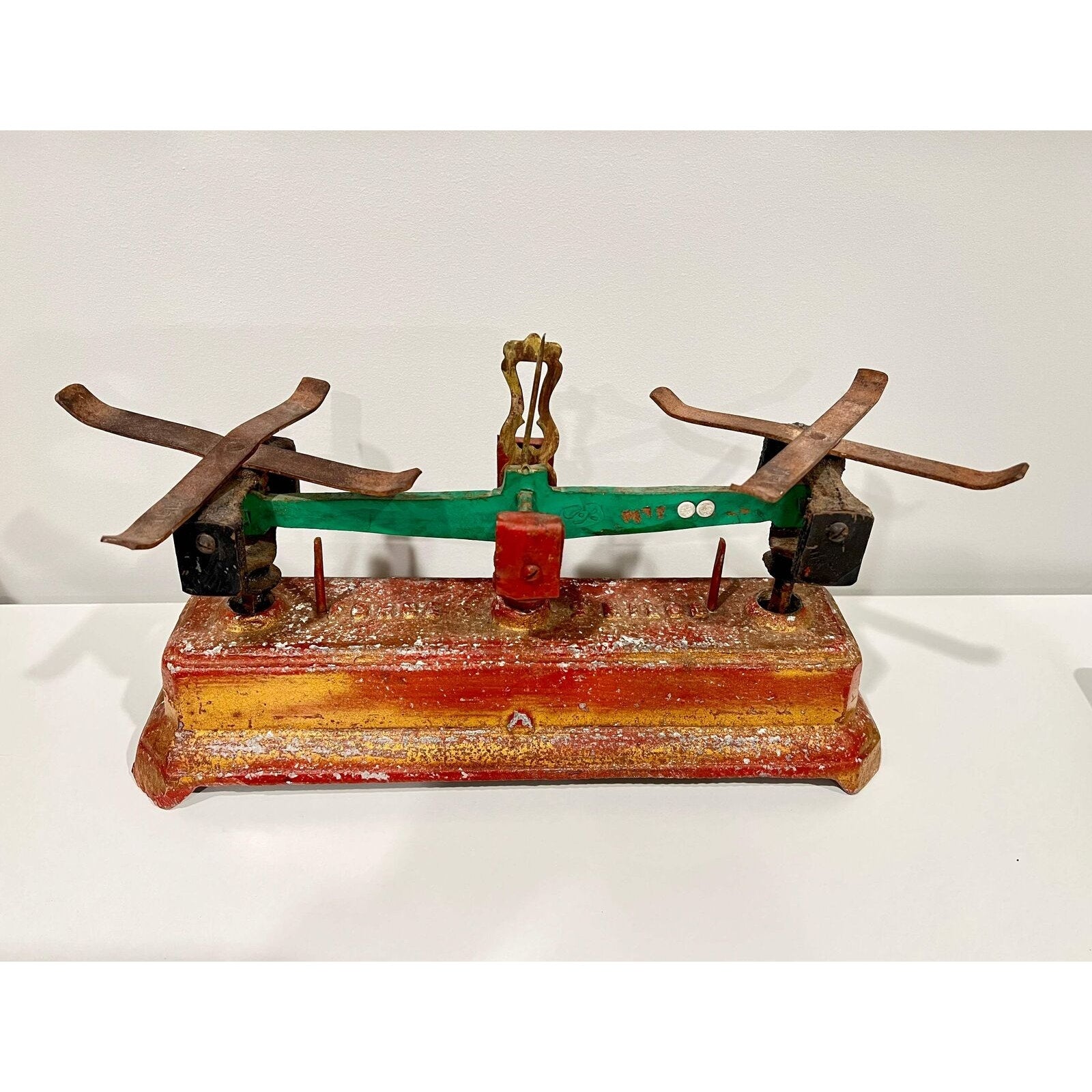 This antique Force cast iron 2 kilogram balance scale is a real gem to see! The base features a beautifully layered and aged combination of red and gold, which is in stunning contrast to the bright green balance arm. This piece is unique and sure to draw attention! This antique Force cast iron 2 kilogram balance scale is a real gem to see! The base features a beautifully layered and aged combination of red and gold, which is in stunning contrast to the bright green balance arm. This piece is unique and sure to draw attention!