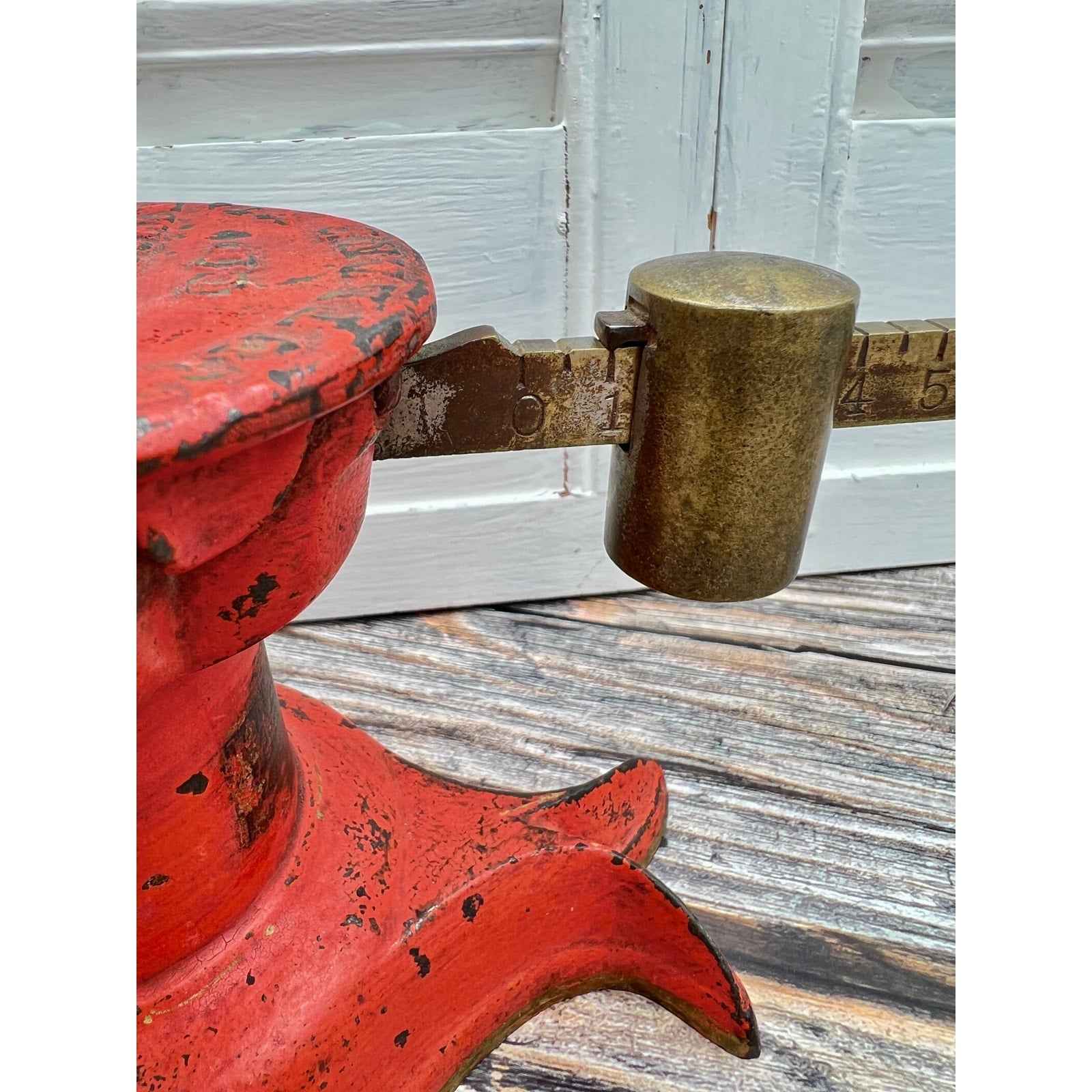This stunning piece of history - an antique balance scale - is from the renowned Howe Scale Company based in Rutland, Vermont. This exquisite scale is a testament to the craftsmanship of the late 19th to early 20th century. The base and the body are made of robust cast iron, painted in a striking red that has aged gracefully to reveal a charming patina indicative of its rich past. The arm and its counterweight boast solid brass construction, showcasing an appealing contrast against the red iron.