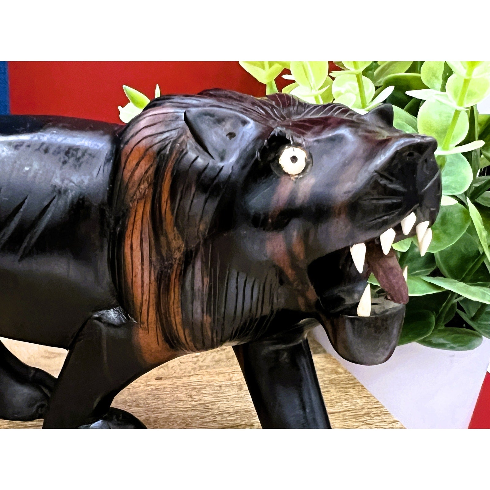 Hand-Carved Ebony Lion Sculpture with Bone Accents 7-Inch Art Decor