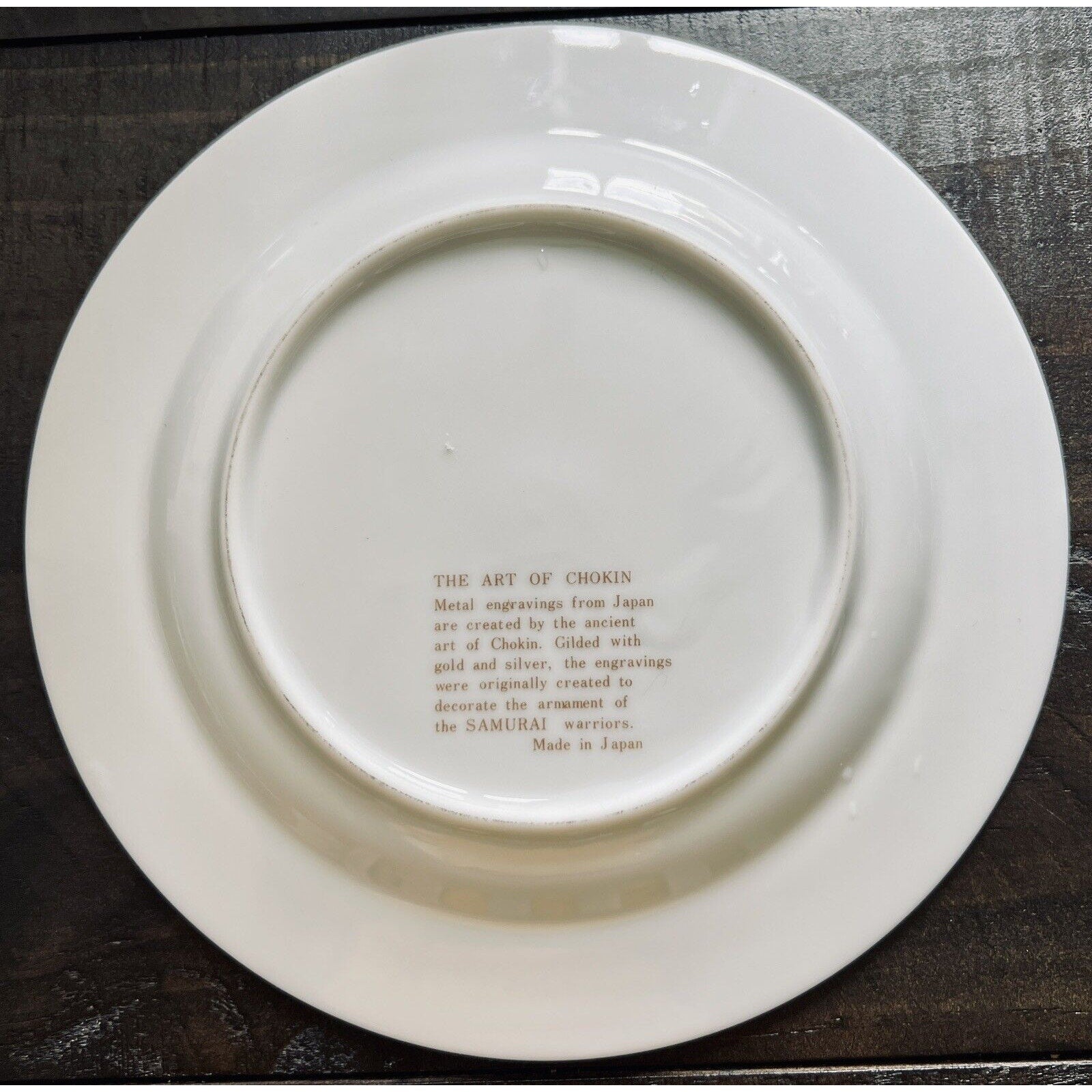 Add a touch of elegance to your dining experience with this pair of vintage Art of Chokin dessert plates. The 6" round porcelain plates are trimmed with 24k gold, featuring intricate designs of peacock, duck, hummingbird, and butterflies. Made in Japan, these collectible plates are made in the ancient chokin style, which originated with the ornate decoration of samurai warrior armor. The white plates are perfect for serving desserts or for displaying on their own. They are in excellent condition and ready to be added to your collection!