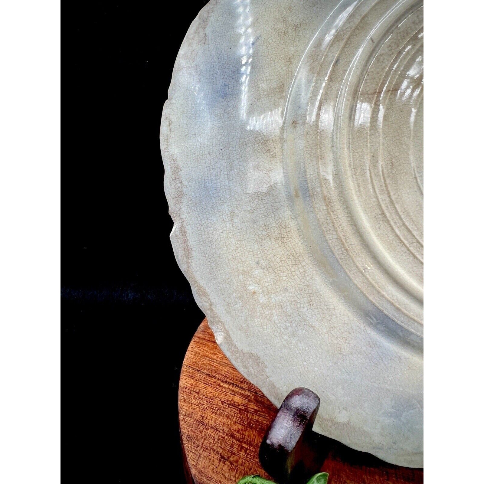 This beautiful Senator Crown Semi-Porcelain plate features a stunning Victorian-era design with the flow blue floral design. It was made in Stoke-on-Trent, Staffordshire, England between 1878-1904 by the J Dimmock & Co, and is a true antique. The plate has a diameter of 9 inches and a height of 1 inch, and weighs 13 oz. It does feature a large stress fracture, as pictured, and the glaze has a beautiful crackle effect demonstrating its antique heritage.