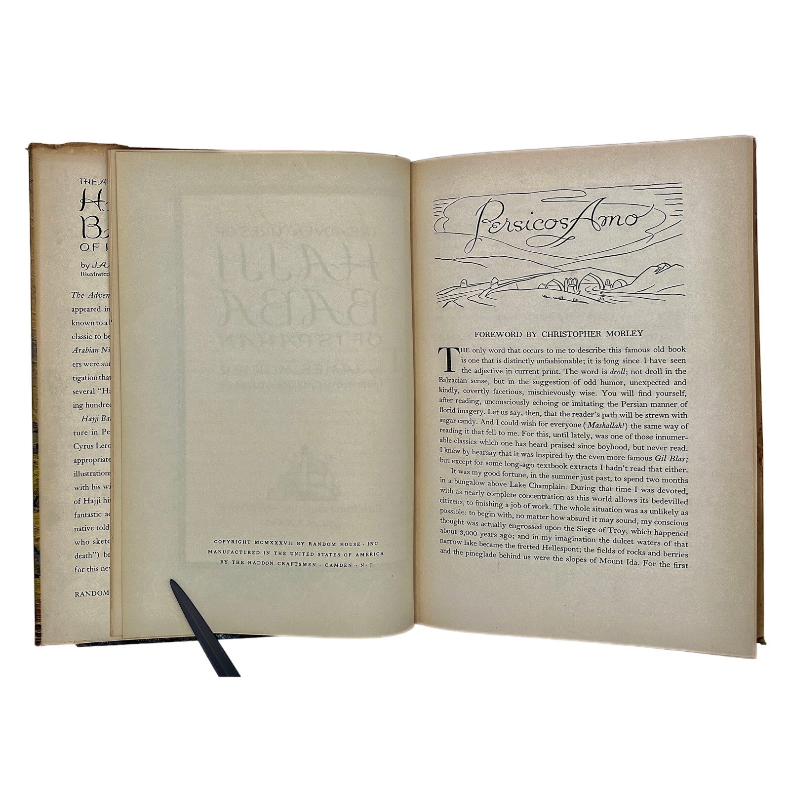 Explore the captivating world of Persia with this beautifully illustrated vintage book. “The Adventures of Hajji Baba of Ispahan” takes you on a journey through the eyes of the eponymous character, offering a blend of Western storytelling and Eastern culture. Published by Random House Inc. in New York in 1937, the book features an elaborately illustrated dust jacket, ornate script, and traditional Middle Eastern artistic motifs.
