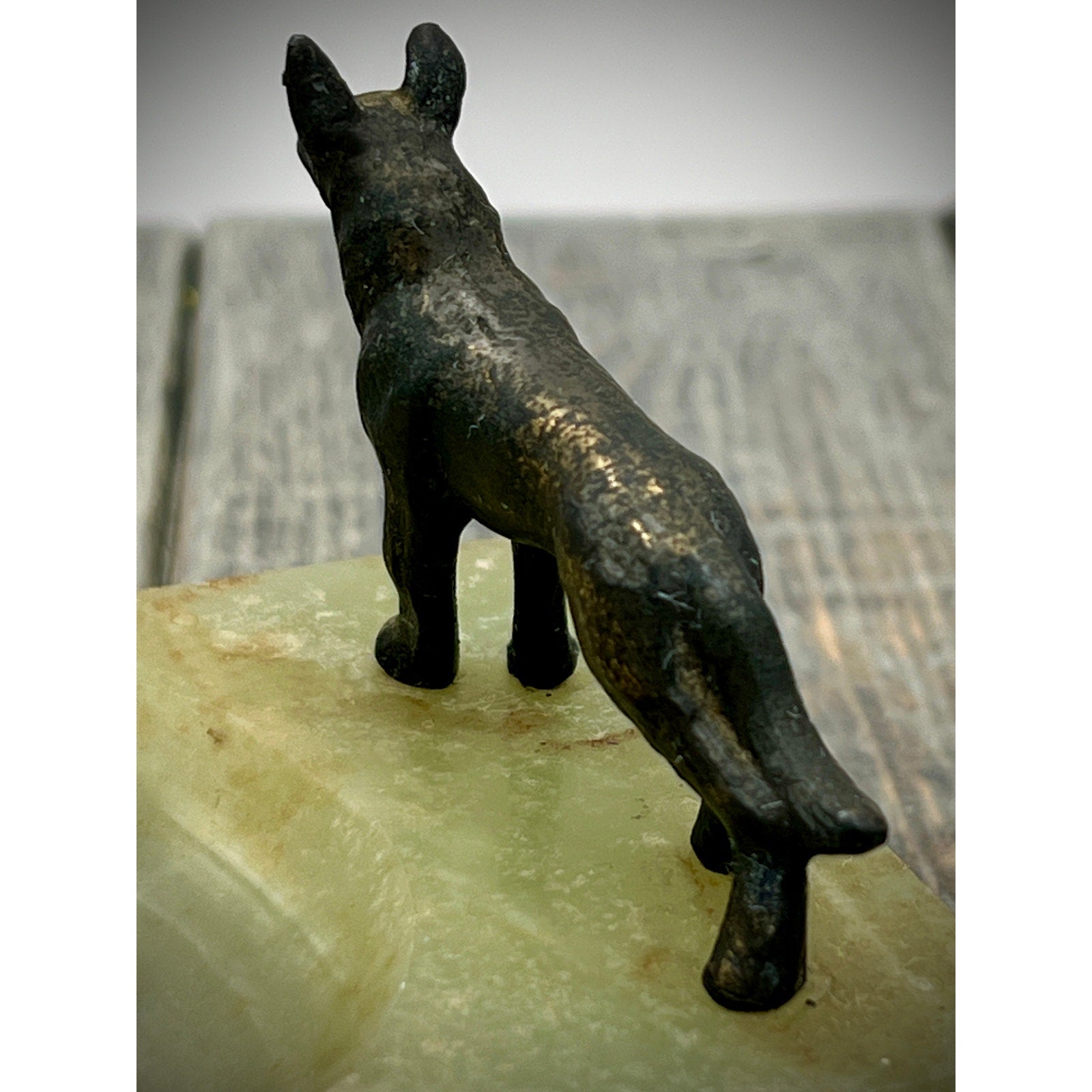 Enhance your decor with this charming vintage brass dog figurine mounted on a polished onyx ashtray. This unique piece features a finely detailed brass dog standing proudly on a beautifully polished onyx base. The onyx showcases a natural pattern with shades of green and brown, adding to its aesthetic appeal. The ashtray's smooth, concave surface makes it perfect for holding small items or simply as a decorative piece.