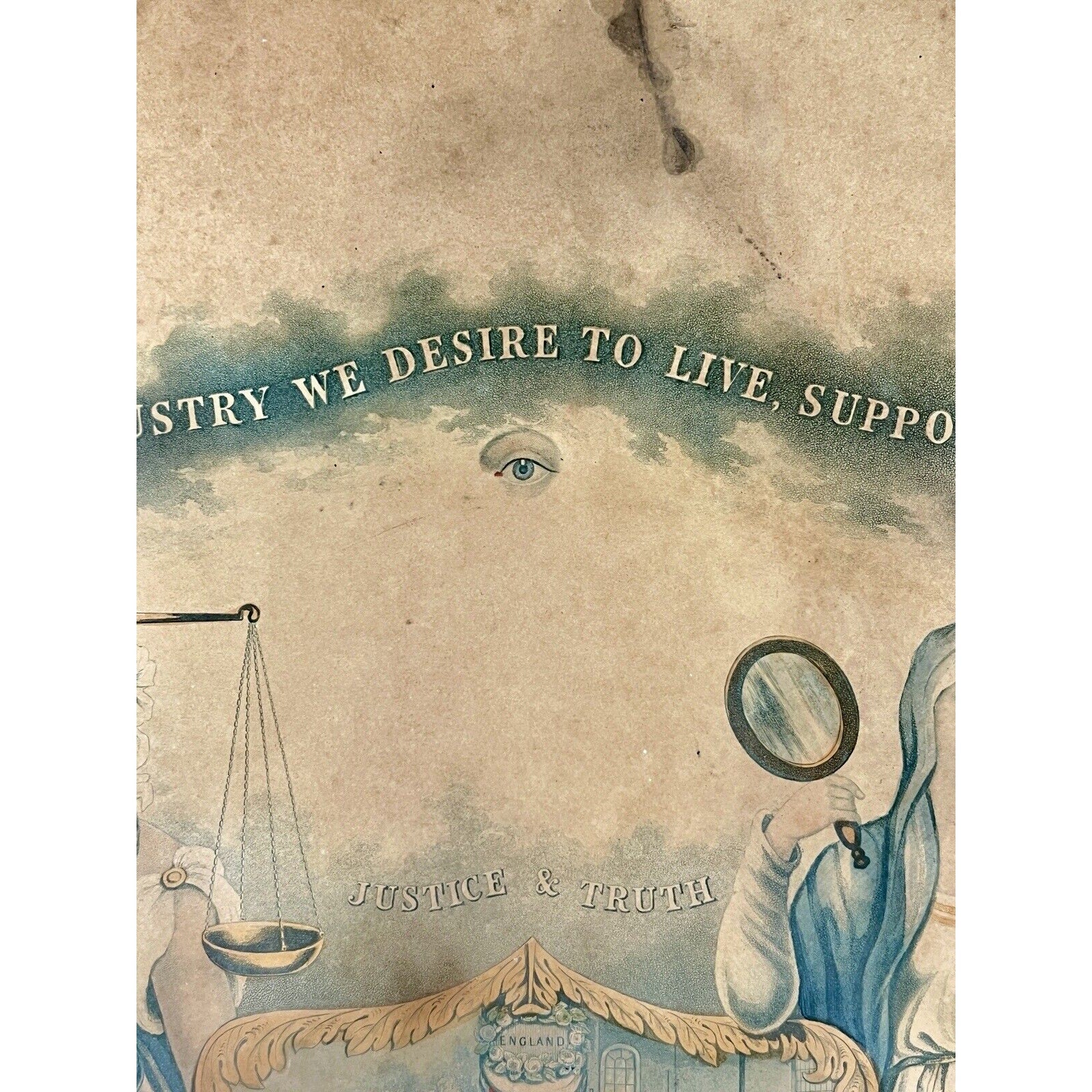 This membership certificate belonged to the United Patriots Benefit & Provident Society, a historic organization founded in 1843 to provide its members with low cost insurance. The certificate from 1861 features intricate designs including an all-seeing eye, four hands grasping together representing members from England, Scotland, Ireland, and Wales. The symbology is abundant in the various designs on the certificate, and the handwritten script is bold.