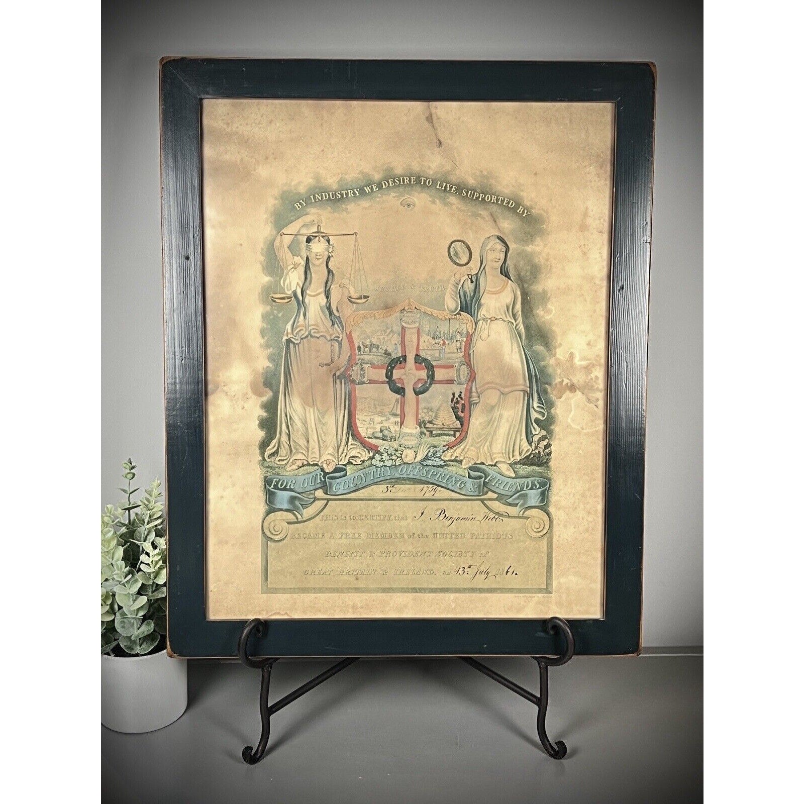 Including the frame, this measures 22in x 18in, and is ready to hang. There are couple water spots and wear appropriate for its age, but it is a beautiful and valuable piece of history for collectors of paper documents, particularly those interested in 19th century societies and organizations.