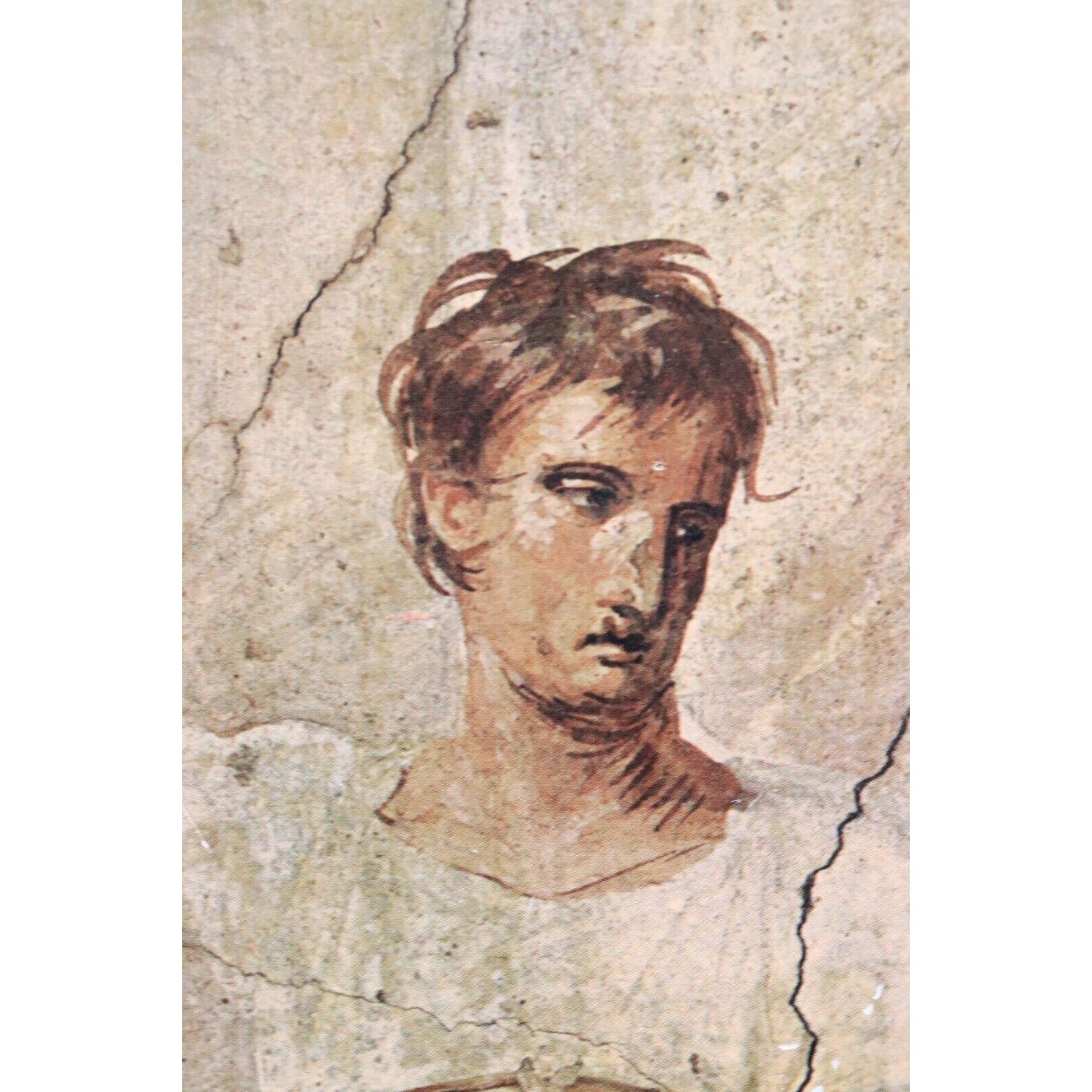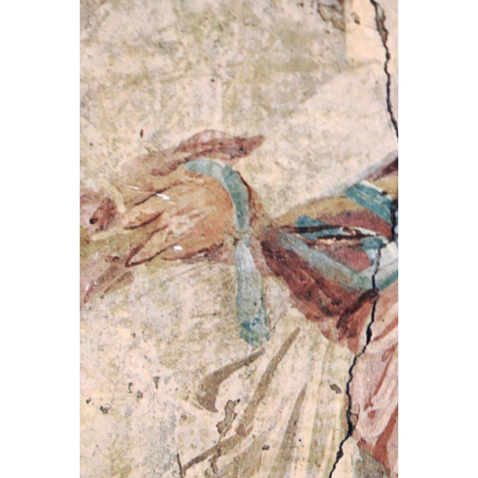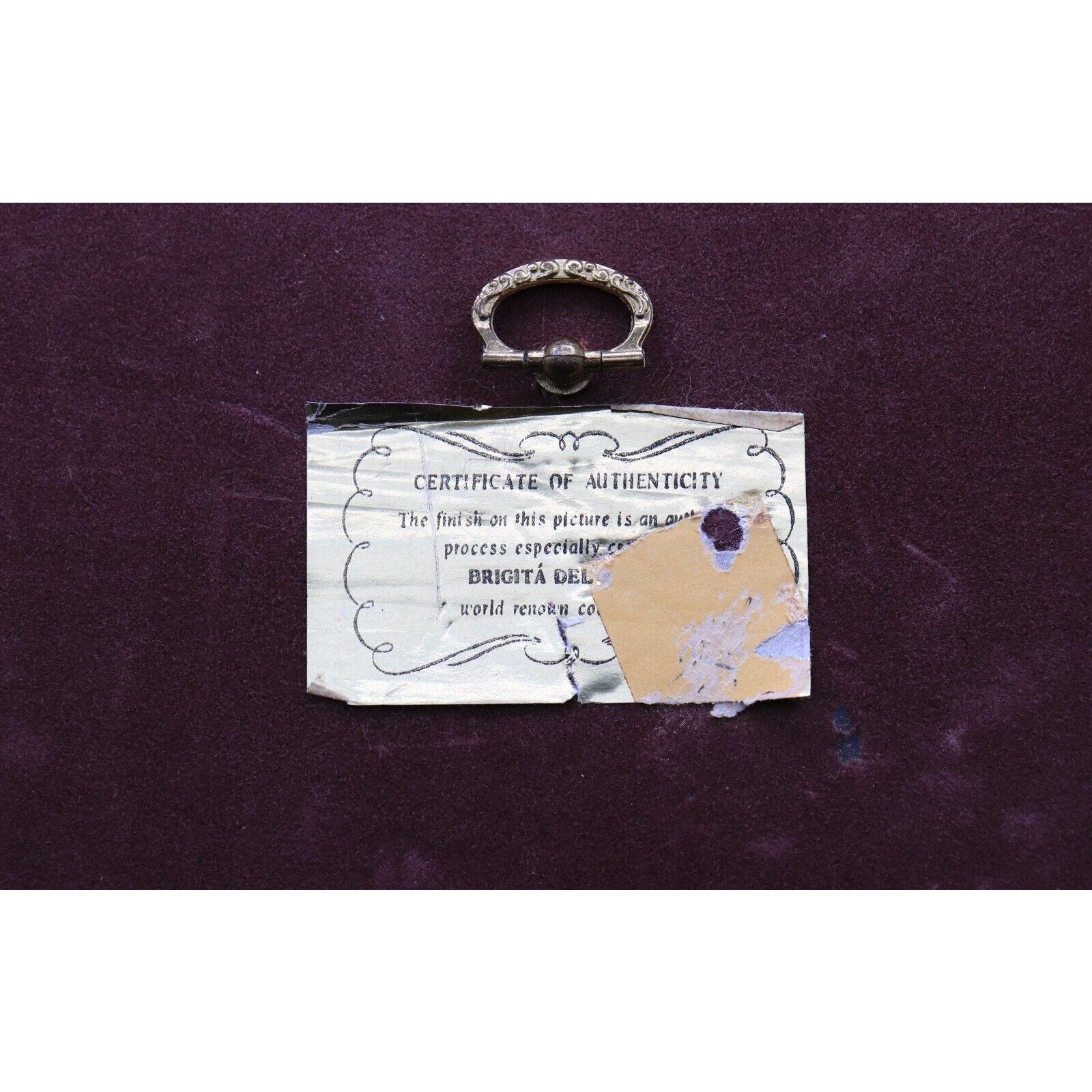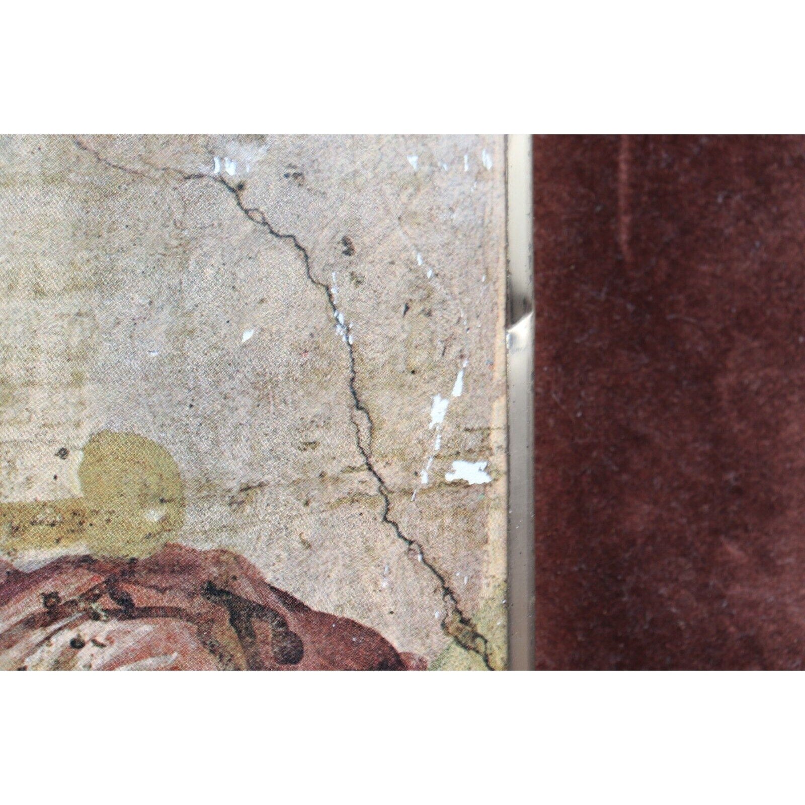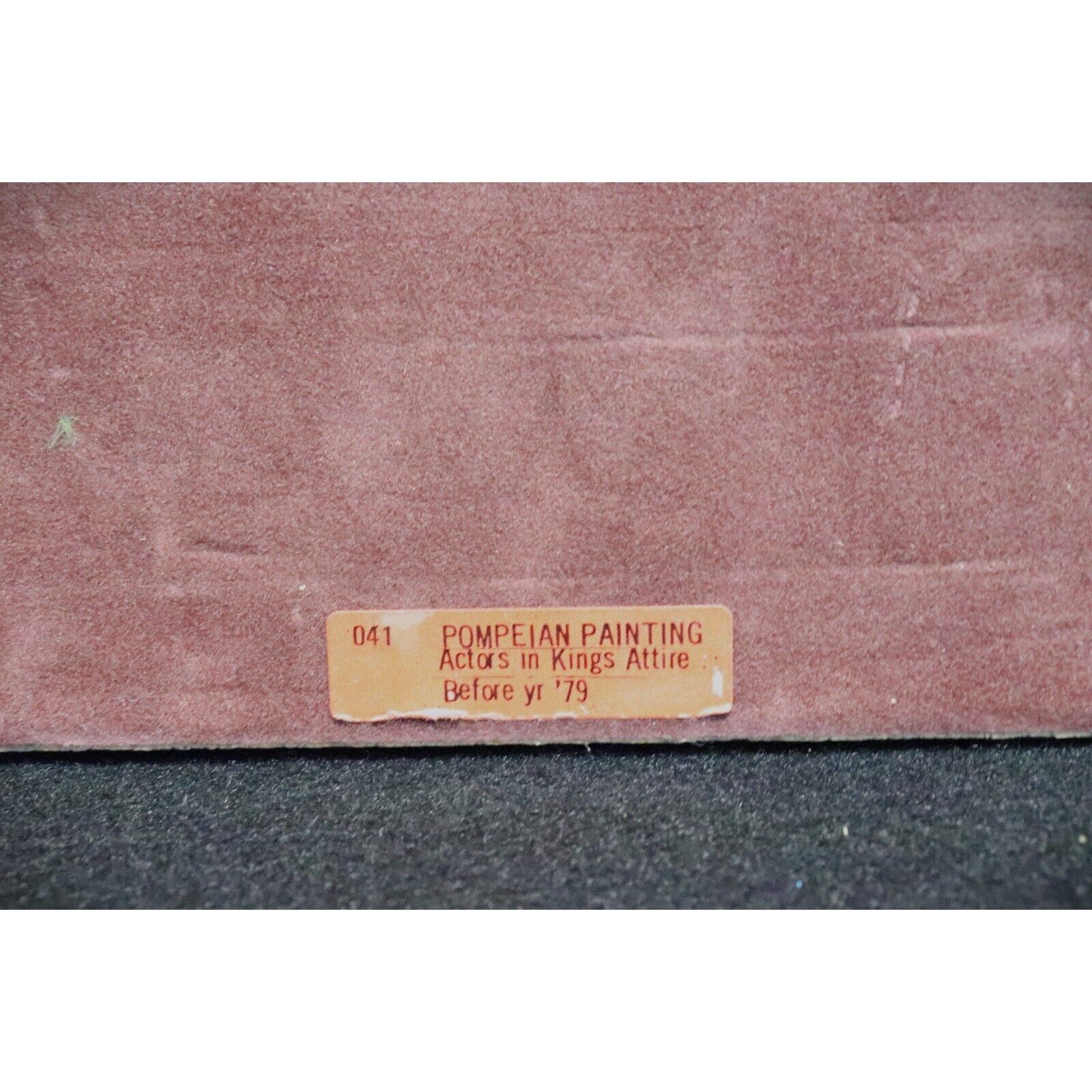 This beautiful vintage print by Brigita del Forno depicts an ancient Pompeian painting of "Actors in Kings Attire" from before 79 A.D. The print measures 10.5" in height and 8" in width, and is mounted on 16" x 12" dark purple velvet in Brigita Del Forno's typical style. While not signed by the artist, it is a handmade piece with her unique glaze technique and features a certificate of authenticity on the back of the frame.