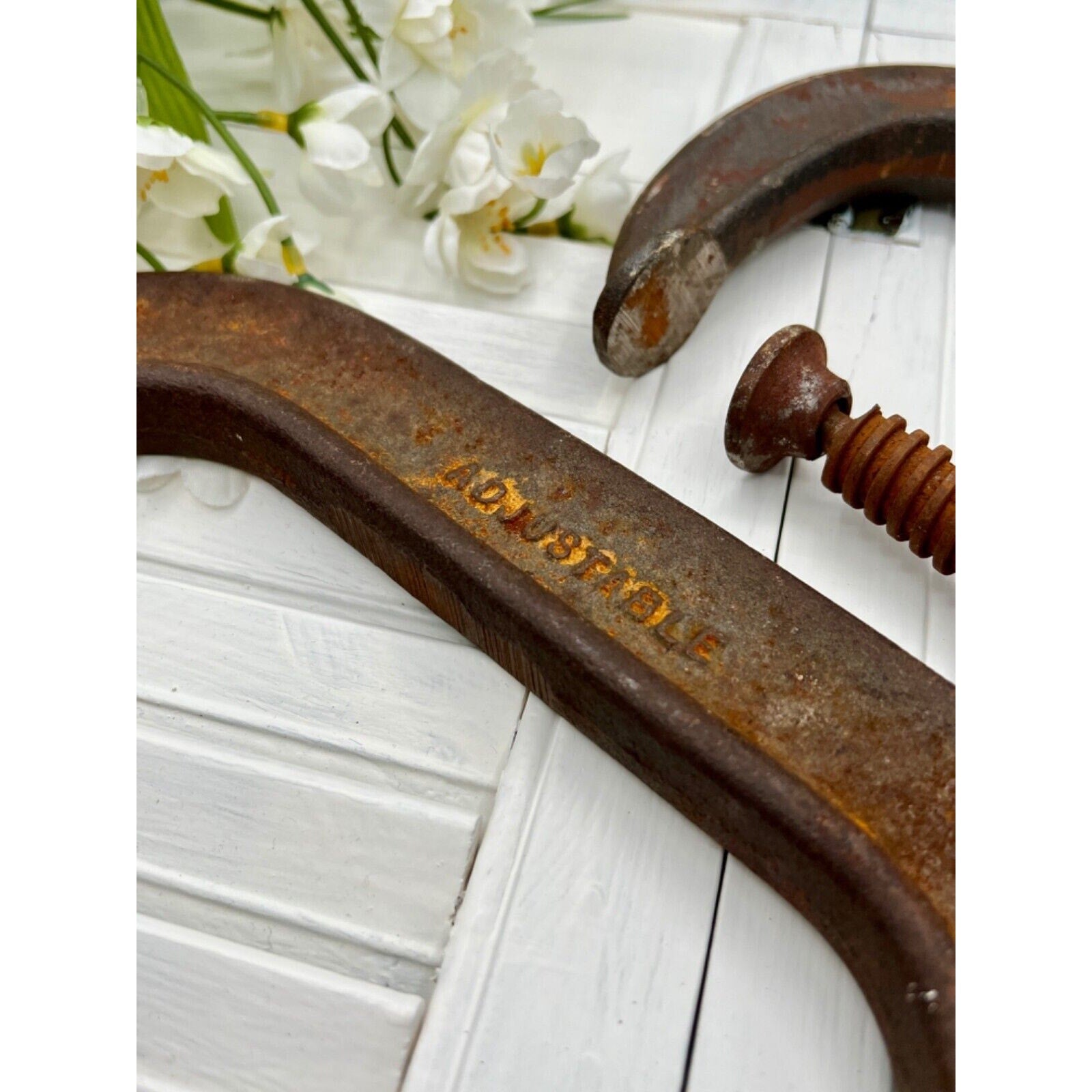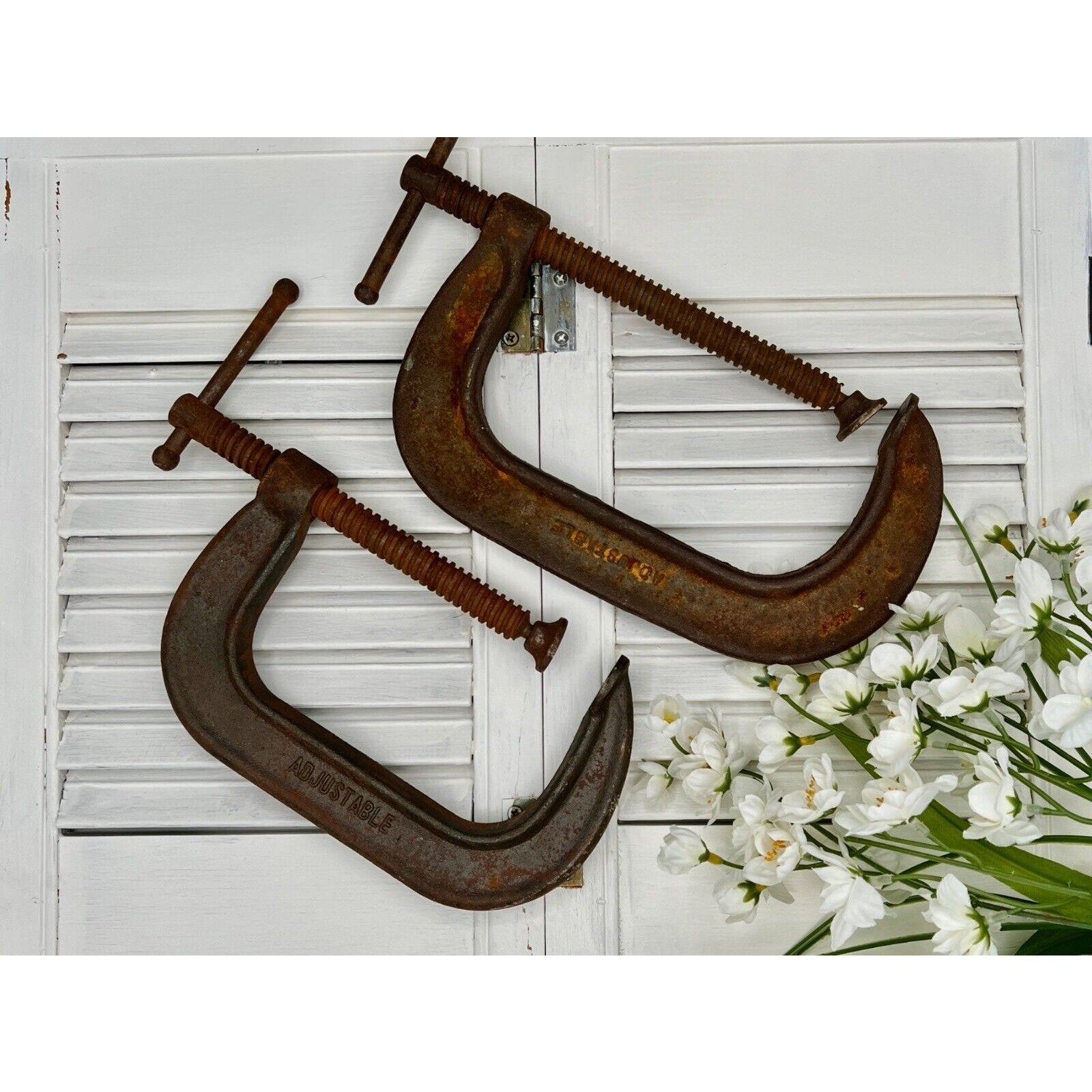 These vintage C-clamps evoke a bygone era of craftsmanship, built from robust steel. Their adjustable design and rust-patina lend character and authenticity to any workshop or collection, reflecting a history of utility and resilience.